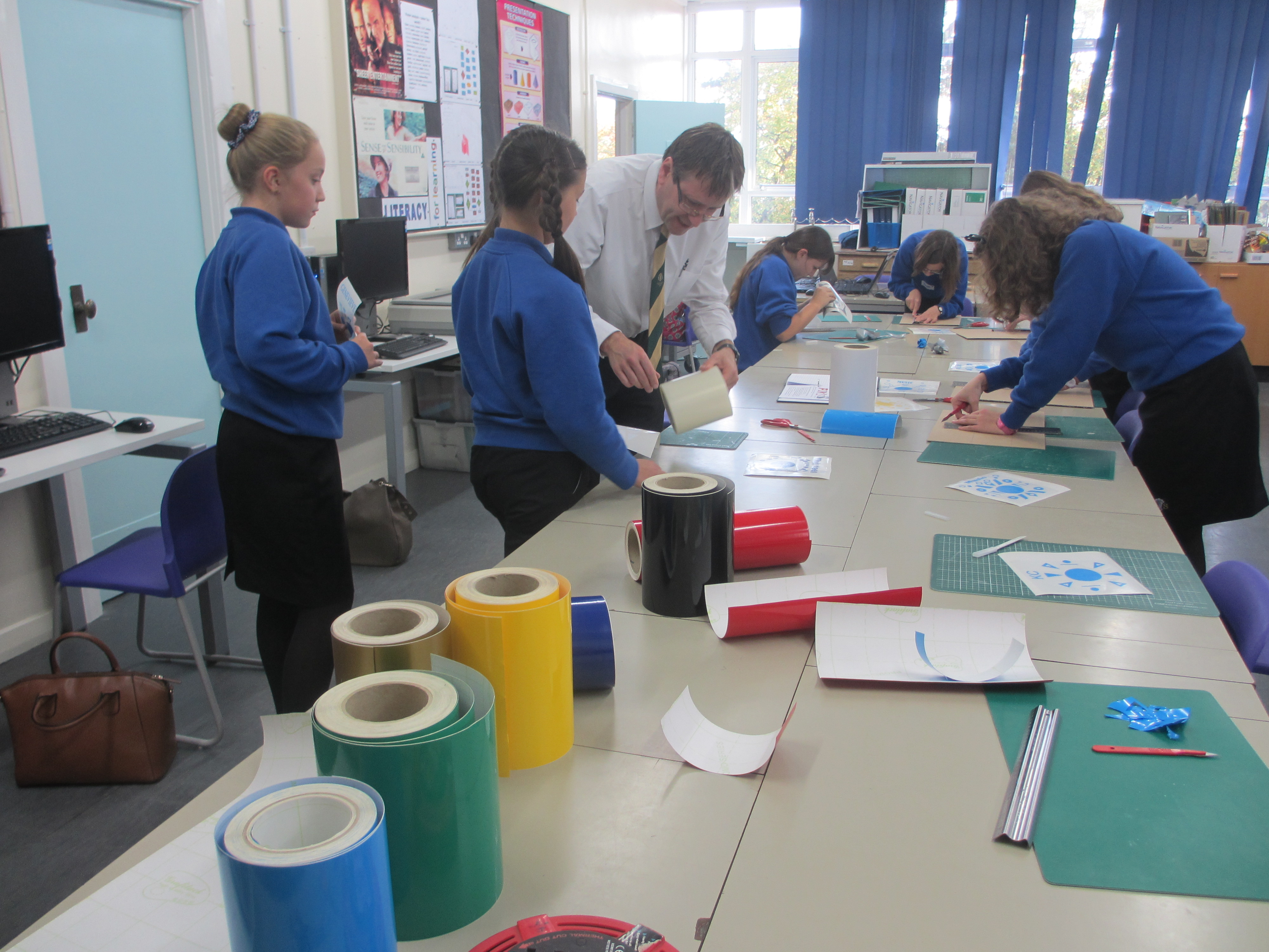 During the graphics session, students got to grips with Computer Aided Design (CAD) to create the pattern for the front of the casing in an Art Deco style, which was cut out using Computer Aided Manufacture (CAM) in self-adhesive vinyl. They applied this to a corrugated card net that had been cut and assembled by the students - quite a job in itself!